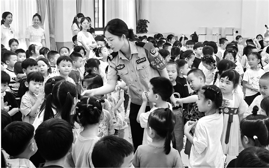 近日,温州龙湾公安永中派出所民警陈思伊走进辖区幼儿园,为小朋友们上了“安全第一课”。民警通过趣味小游戏、有奖问答等小朋友们喜欢的方式,讲解了校园安全、交通安全、预防电信网络诈骗等知识,在萌娃心中播下安全的种子。 通讯员 谢博 摄