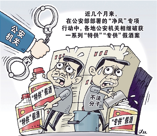 | 市场监管总局日前发布关于严禁制售“特供酒”的公告,从生产、销售、餐饮、广告、宣传、印刷等6个方面严禁各类生产经营主体从事“特供酒”制售违法行为。 近几个月来,在公安部部署的“净风”专项行动中,各地公安机关相继破获一系列“特供”“专供”假酒案。 新华社 徐骏 作 |