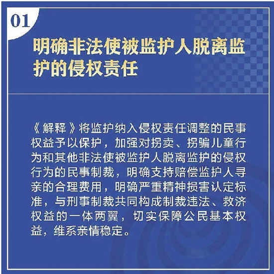 司法解释明确非法使被监护人脱离监护的侵权责任,支持赔偿监护人寻亲的合理费用;明确严重精神损害认定标准。与刑事制裁共同构成制裁违法、救济权益的一体两翼,切实保障公民基本权益,维系亲情稳定。