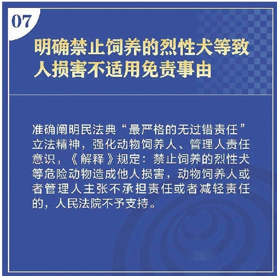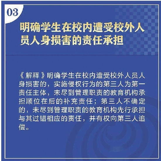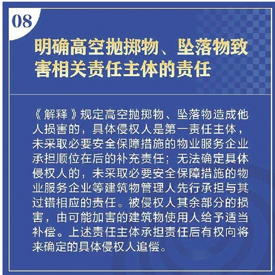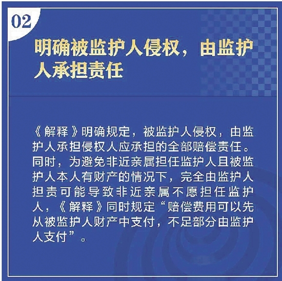 司法解释明确规定,被监护人侵权,监护人承担全部责任而非补充责任。同时,明确学生在校内遭受校外人员人身损害的,实施侵权行为的第三人为第一责任主体,未尽到管理职责的教育机构承担顺位在后的补充责任;明确缺陷产品造成产品自损属于产品责任赔偿范围;明确禁止饲养的烈性犬等危险动物致人损害不适用免责事由;明确高空抛掷物、坠落物致害相关责任主体的责任等。
