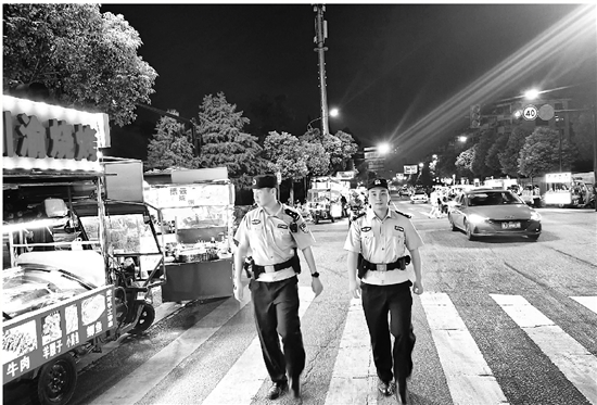 台州市椒江区界牌头夜市生意闹猛,连日来,椒江公安府前派出所结合“夏季行动”和勤廉公安建设,加大对夜市的巡逻防控力度,确保群众“放心逛”,助力“夜经济”发展。 通讯员 何文斌 摄