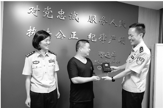 近日,临海市公安局在杜桥派出所会议室举行授奖仪式,对寒冬下河救人的杨周玉、半夜夺刀救人的徐明果授予见义勇为荣誉。图为徐明果接过荣誉证书。 通讯员 叶明銮 摄