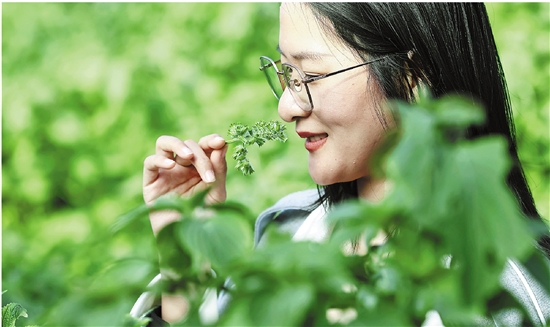 图为10月12日,游人在桦南县紫苏种植实验基地的塑料大棚内体验紫苏的香气。