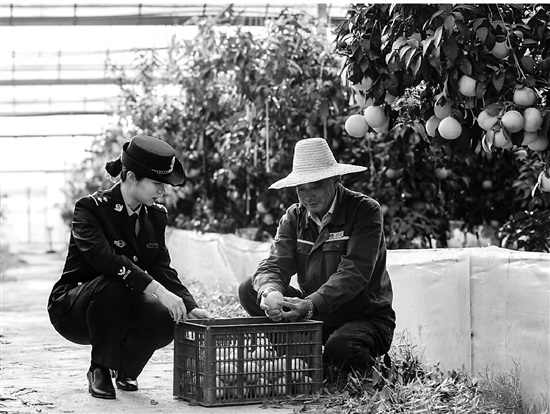 深秋时节,“红美人”开始大批量上市。连日来,湖州市南浔区练市镇的“红美人”基地里,民警向果农了解基地生产情况,并就相关注意事项进行提醒,助推“甜蜜”共富。 通讯员 陆剑峰
