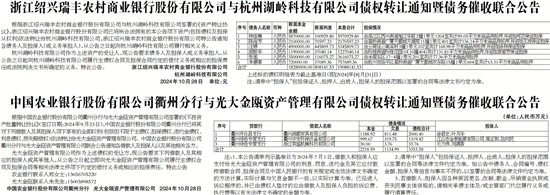 根据浙江绍兴瑞丰农村商业银行股份有限公司与杭州湖岭科技有限公司签署的《资产转让协议》,浙江绍兴瑞丰农村商业银行股份有限公司已将所合法拥有的本公告项下资产(包括债权及担保从权利)依法转让给杭州湖岭科技有限公司,浙江绍兴瑞丰农村商业银行股份有限公司特公告通知各债务人及担保人(或义务承担人),从公告之日起向杭州湖岭科技有限公司履行相关义务。
