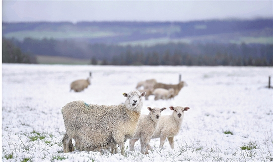 图为10月26日在新西兰坎特伯雷拍摄的被春雪覆盖的牧场和羊。
