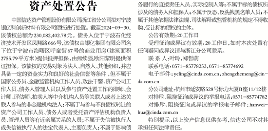 中国信达资产管理股份有限公司浙江省分公司拟对宁波银亿科创新材料有限公司债权进行处置。截至2024-09-30,该债权总额为230,082,402.78元。债务人位于宁波石化经济技术开发区凤翔路666号,该债权由银亿集团有限公司名下位于宁波市海曙区呼童街67号的商业用房(建筑面积2755.79平方米)提供抵押担保,由熊续强,欧阳黎明提供保证担保。该债权的交易对象为法人、自然人、其他组织,并应具备一定的资金实力和良好的社会信誉等条件 ,但不属于国家公务员、金融监管机构工作人员、政法干警、资产公司工作人员、债务人管理人员以及参与资产处置工作的律师、会计师、评估师、拍卖人等中介机构人员等关联人或者上述关联人参与的非金融机构法人;不属于与参与不良债权转让的资产公司工作人员、债务人或者受托资产评估机构负责人员、管理人员等有近亲属关系的人员;不属于失信被执行人或失信被执行人的法定代表人、主要负责人;不属于影响债务履行的直接责任人员、实际控制人等;不属于标的债权所涉及的债务人和担保人;不属于反恐、反洗钱黑名单人员;不属于其他依据法律法规、司法解释或监管机构的规定不得收购、受让标的债权的主体。