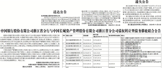 根据中国银行股份有限公司浙江省分行与中国长城资产管理股份有限公司浙江省分公司达成的债权转让安排,中国银行股份有限公司浙江省分行(含各分支行)将其对公告清单所列借款人及其担保人享有的主债权及借款合同、担保合同、抵债协议、还款协议和其他相关协议项下的全部权利,依法转让给中国长城资产管理股份有限公司浙江省分公司。中国银行股份有限公司浙江省分行特公告通知各借款人、担保人以及借款人、担保人因各种原因发生更名、改制、歇业、吊销营业执照或丧失民事主体资格等情况的相关承债主体或清算主体。