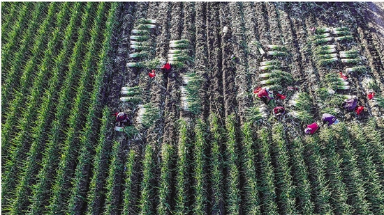 图为11月3日,河北省玉田县彩亭桥镇农民在收获大葱(无人机照片)。