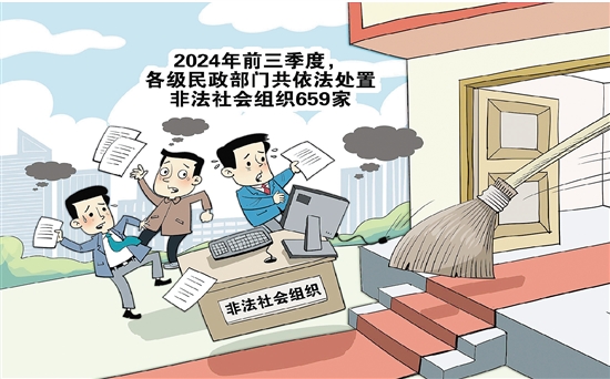 记者日前从民政部获悉,2024年前三季度,各级民政部门共依法处置非法社会组织659家,其中取缔152家、劝散383家、引导登记124家;发布涉嫌非法社会组织名单105个。