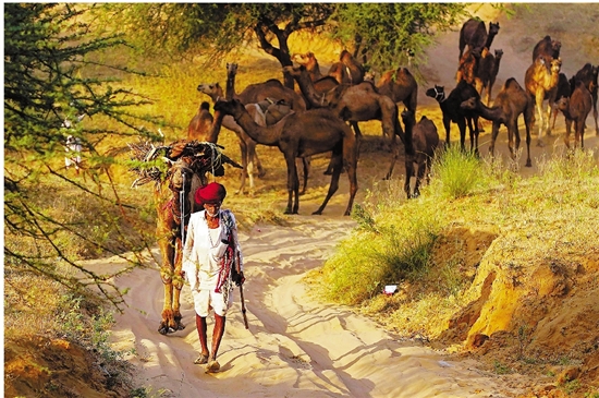 一年一度的普什卡尔集市以牲畜交易,特别是骆驼贸易闻名,也被称作“骆驼集市”。图为11月4日,在印度拉贾斯坦邦普什卡尔,骆驼商人带领驼队前行。