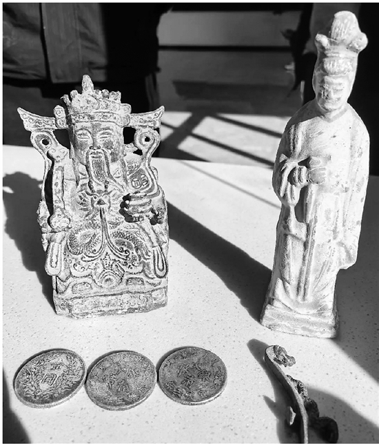 不一会儿,3枚古钱币就露出地面。挖到宝的潘先生顺势在周围继续发掘,还陆续挖出了两座陶像以及一枚带钩。