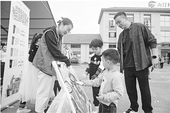 11月16日,参加游园会的亲子家庭在姚江镇山汀村体验垃圾分类回收的小游戏。