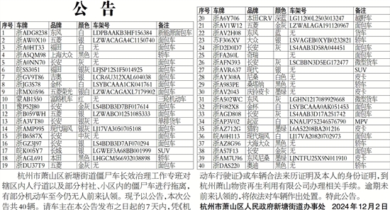 杭州市萧山区新塘街道僵尸车长效治理工作专班对辖区内人行道以及部分村社、小区内的僵尸车进行拖离,有部分机动车至今仍无人前来认领。现予以公告,本次公告共40辆。请车主在本公告发布之日起的7天内,凭《机动车行驶证》或车辆合法来历证明及本人的身份证明,到杭州萧山物资再生利用有限公司办理相关手续。逾期未前来认领的,将依法对车辆作出处置。特此公告。