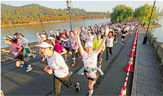 12月1日,“奔跑的你 美如西子”2024杭州女子半程马拉松靓丽开跑,8000名参赛选手迎着初冬朝阳,在西湖的湖光山色间跃步奔跑,分别完成半程马拉松和10公里环湖跑的赛程,展示现代女性的健康与美丽。