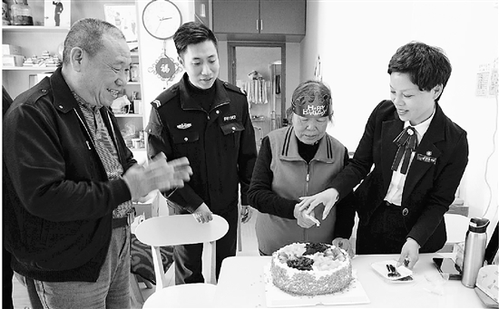 12月2日,临海市公安局大洋派出所民警和当地一家物业公司工作人员为独居老人过生日。临海市公安局开展“警民融合”工作以来,大洋派出所积极探索推行“1+N帮1”的警务新模式,社区民警主动联系物业公司,为社区独居老人建立长期帮扶机制,免费为老人安装一键报警系统,提供十项暖心服务等,托起老人幸福生活。