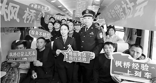 本报讯 让先进经验在车厢发光,请热心乘客为旅途守护。在12月4日第十一个国家宪法日来临前夕,浙江省总工会组织牵头铁路杭州客运段甬广车队、杭州乘警支队乘务四大队、诸暨市总工会、绍兴枫桥学院、杭州市上城区朱学军法官调解工作室、温州市瓯越调解中心共同开展“枫桥经验”上列车宣讲活动,发挥联动效应,打造平安列车。