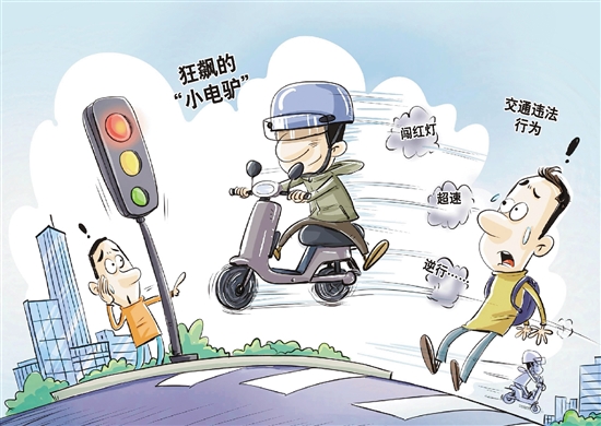 | 人称“小电驴”的电动自行车,凭借轻便灵活的特点,成为许多人的出行首选。但在一些城市,“小电驴”闯红灯、超速、逆行等交通违法行为屡禁不绝,导致不少交通事故和人员伤亡。 今年以来,全国多地开展专项整治行动,加大对电动自行车交通违法行为的查处。 新华社 王鹏 作 |