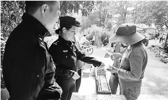 日前,金华市公安局婺城分局禁毒大队联合罗店派出所、罗店镇禁毒办,在尖峰山脚下摆摊开展禁毒宣传活动,通过禁毒宣传展板、毒品仿真样品盒、禁毒拼字小游戏等方式,向登山游客宣传禁毒知识,增强群众对毒品的防范意识。 通讯员 朱明月 摄