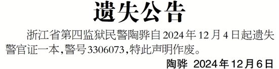 浙江省第四监狱民警陶骅自2024年12月4日起遗失警官证一本,警号3306073,特此声明作废。