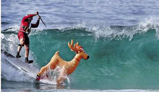 12月8日,在美国加利福尼亚州的达纳角索尔特克里克海滩,参加圣诞老人冲浪比赛的选手在冲浪。