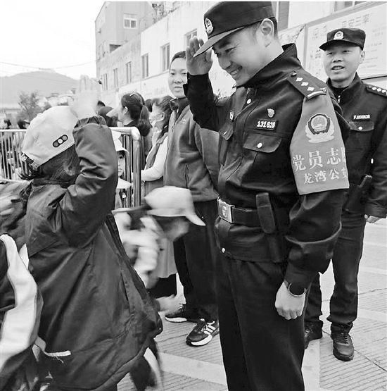 | 校门口“双向奔赴” 近日,正值放学高峰,温州市龙湾区状元第三小学校门口,龙湾公安状元派出所民警戴其式守在“护学岗”上,维护治安、交通秩序。一名小学生走过他身边时,特地停下,向他敬了个礼,戴其式微笑着回礼。这暖心的一幕令周围人也都忍不住嘴角上扬。 通讯员 郑斌方 摄 |