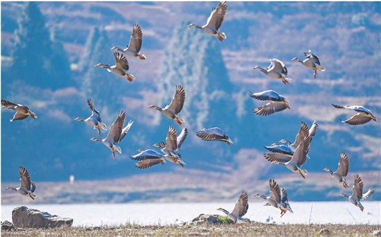 | 地处贵州省毕节市威宁县的草海国家级自然保护区是一个完整、典型的高原湿地生态系统,是国家一级保护动物黑颈鹤的主要越冬地之一。近年来,当地加大对草海生态系统修复力度和巡护力度,黑颈鹤数量逐年增加。 目前,前来草海越冬的黑颈鹤已达2500余只,加上灰鹤、斑头雁、赤麻鸭等,鸟类总数将达10万只,呈现万鸟翔集的生态景象。 新华社 杨文斌 摄 |