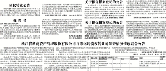 2、本公告清单仅列示截至2024年3月24日的贷款本金余额,借款人和担保人应支付给陈远玲的利息、罚息、违约金及其它应付款按借款合同、担保合同及中国人民银行的有关规定或生效法律文书确定的方法计算,实际计算与欠息金额不一致,以实际计算为准。已经进入诉讼程序的,并已由浙江省浙商资产管理股份有限公司垫付的应由借款人及担保人负担的诉讼费、执行费等以有关法律文书确定的金额为准。