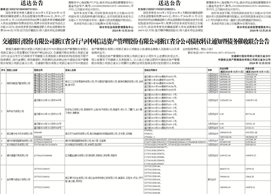根据交通银行股份有限公司浙江省分行与中国信达资产管理股份有限公司浙江省分公司签署的《不良资产转让协议》,交通银行股份有限公司浙江省分行(含各分支行)已将其对下列借款人及其担保人享有的权利(包括但不限于担保债权、违约金债权、损失赔偿权、利息债权)依法转让给中国信达资产管理股份有限公司浙江省分公司。交通银行股份有限公司浙江省分行与中国信达资产管理股份有限公司浙江省分公司联合公告通知各借款人及担保人以及其他相关各方。