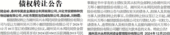 根据债权转让方湖州吴兴永邦民间资金管理股份有限公司与受让方湖州吴兴万邦小额贷款股份有限公司于2024年12月18日签订的债权转让协议,湖州吴兴永邦民间资金管理股份有限公司将其享有(2024)浙0502诉前调确2015号民事裁定书中享有的主债权及其从权利全部转让给湖州吴兴万邦小额贷款股份有限公司。湖州吴兴永邦民间资金管理股份有限公司特公告与该债权有关的债务人、担保人及其他当事人该债权转让的事实,自债权转让协议签订之日起,湖州吴兴万邦小额贷款股份有限公司实行债权人的一切权力,请债务人、连带担保人及相关债务人直接向湖州吴兴万邦小额贷款股份有限公司履行偿还欠款本息的义务。特此公告!