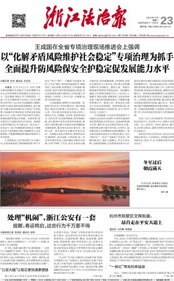 本报讯 12月20日上午,全省“化解矛盾风险维护社会稳定”专项治理暨中央有关文件贯彻落实现场推进会在杭州召开。会议强调,要深入学习贯彻党的二十届三中全会精神和中央经济工作会议精神,深学笃行习近平总书记重要指示精神,按照中央政法委和省委部署要求,深入推进“化解矛盾风险维护社会稳定”专项治理,全面提升防风险保安全护稳定促发展能力水平,为奋力谱写中国式现代化浙江新篇章提供坚强安全保障。省委常委、政法委书记王成国出席会议并讲话。省委政法委常务副书记卫中强主持。省公安厅、省司法厅、省卫生健康委负责同志分别就未成年人犯罪预防治理、刑满释放人员安置帮教、严重精神障碍患者服务救助等工作作部署。
