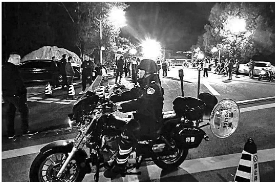 “冬季行动”中,台州市公安局椒江分局巡特警大队在加大巡逻防控力度的同时,积极向群众宣传安全防范知识,切实提高群众的安全感。图为骑警在街头夜巡。