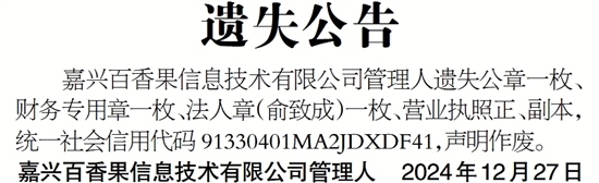 嘉兴百香果信息技术有限公司管理人遗失公章一枚、财务专用章一枚、法人章(俞致成)一枚、营业执照正、副本,统一社会信用代码 91330401MA2JDXDF41,声明作废。