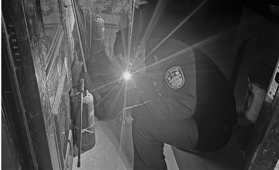 近日,台州椒江公安前所派出所结合“冬季行动”,在夜间组织警力对辖区出租房进行安全检查,消除治安和消防安全隐患,确保出租房安全。图为民警在出租房内检查灭火器。 通讯员 何文斌 摄