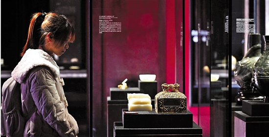 | 1月6日,观众参观白玉盘龙钮“大清受命之宝”。 当日,“玉出昆冈——清代宫廷和田玉文化特展”在北京故宫博物院开幕。展览遴选258件具有代表性的清代宫廷和田玉精品,分为“玉之源”“玉之礼”“玉之雅”“玉之巧”“玉之用”五个单元,诠释清代和田玉文化,展现清代各民族之间的交往交流交融,弘扬中华优秀传统文化。 新华社 金良快 |