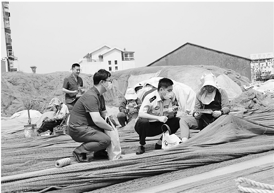 每年开渔期前,法庭干警全员出动,前往各个村社、渔业合作社巡回办案。法庭副庭长余秀宝开展“见缝插针”式普法,趁着渔民整理渔船渔具休息的间隙进行提醒,“阿哥,过几天就要下海了吧?要注意安全,捕捞作业时,一定要严格遵守国家有关规定。祝你们满载而归!”