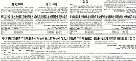 根据中国中信金融资产管理股份有限公司浙江省分公司与光大金瓯资产管理有限公司签订的《债权转让协议》,中国中信金融资产管理股份有限公司浙江省分公司已将其对下列借款人及其担保人享有的权利(包括但不限于担保债权、违约金债权、损失赔偿权、利息债权)依法转让给光大金瓯资产管理有限公司。中国中信金融资产管理股份有限公司浙江省分公司特通知各债务人及担保人(或义务承担人),从公告之日起向光大金瓯资产管理有限公司履行相关义务。光大金瓯资产管理有限公司作为上述资产的受让方,现公告要求债务人及担保人或义务承担人,从公告之日起向光大金瓯资产管理有限公司履行主债权合同及担保合同约定的偿付义务或相应的担保责任或法院判决文书所确定的义务。特此公告。