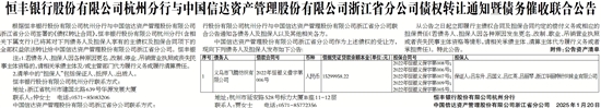 根据恒丰银行股份有限公司杭州分行与中国信达资产管理股份有限公司浙江省分公司签署的《债权转让合同》,恒丰银行股份有限公司杭州分行(含相关下属支行)已将其对下列债务人及担保人享有的主债权及担保合同项下的全部权益依法转让给中国信达资产管理股份有限公司浙江省分公司。恒丰银行股份有限公司杭州分行与中国信达资产管理股份有限公司浙江省分公司联合公告通知各债务人及担保人以及其他相关各方。
