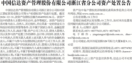 中国信达资产管理股份有限公司浙江省分公司资产处置公告