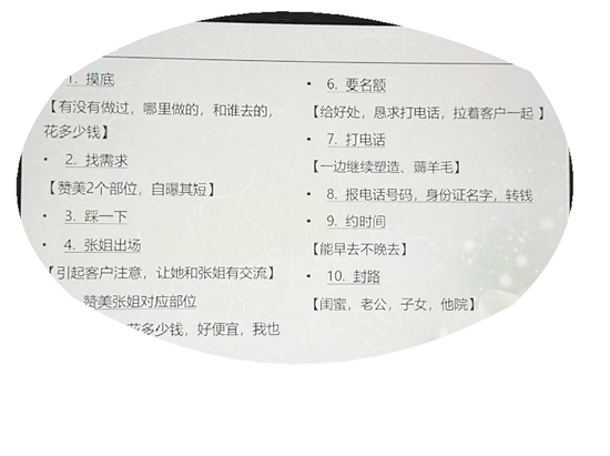 “客户在一个房间做护肤项目时,美容院的工作人员会询问是否接受拼房。一旦客户同意,美容院提前安排的‘托’——一名漂亮女人就登场了,一场‘围猎’也开始了。”课件里说,其间漂亮女人会出门,工作人员假装窃窃私语,以“她怎么变漂亮了”“她做了什么项目”等话语吸引客户。等漂亮女人进来,工作人员再假装询问,漂亮女人则介绍医美项目情况,工作人员会“恰到好处”地表达需求,并游说客户一起做。如果客户有意向,工作人员就催促客户一起转钱并约好做医美的时间。