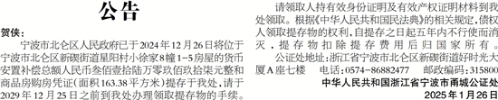 宁波市北仑区人民政府已于2024年12月26日将位于宁波市北仑区新碶街道星阳村小徐家8幢1-5房屋的货币安置补偿总额人民币叁佰壹拾陆万零玖佰玖拾柒元整和商品房购房凭证(面积163.38平方米)提存于我处,请于2029年12月25日之前到我处办理领取提存物的手续。