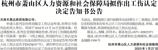 杭州市萧山区人力资源和社会保障局拟作出工伤认定决定告知书公告
