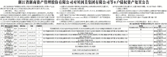 浙江省浙商资产管理股份有限公司拟对贝因美集团有限公司等8户企业债权资产进行处置,拟以公开竞价或协议转让等方式进行,现予以公告。