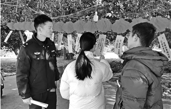 2月10日,温州市公安局龙湾区分局状元派出所社区民警张家炫在状元文化公园里开展“元宵反诈护平安”活动,将反诈、禁毒等知识巧妙融入传统猜灯谜环节,寓教于乐,让群众在趣味猜谜中学习防范知识。 通讯员 林齐虎 摄