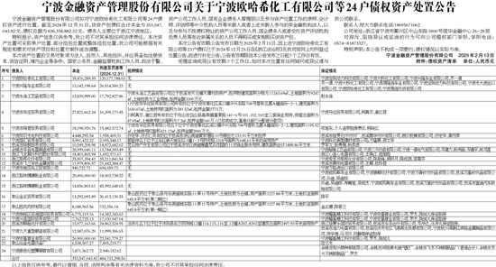 宁波金融资产管理股份有限公司拟对宁波欧哈希化工有限公司等24户债权资产进行处置。截至2024年12月31日,该资产包债权合计本金为353,547,043.82元,债权总额为838,358,882.32元。债务人主要位于浙江宁波地区。