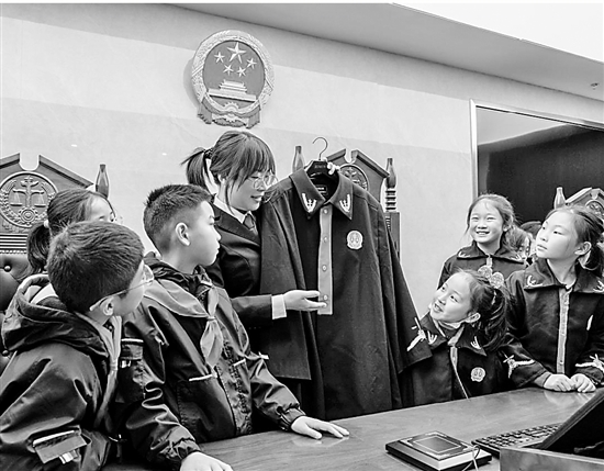 近日,舟山市中级人民法院开展公众开放日活动,小朋友们走进法院,参观审判法庭,体验模拟法庭,零距离感受法治力量。 通讯员 张璐