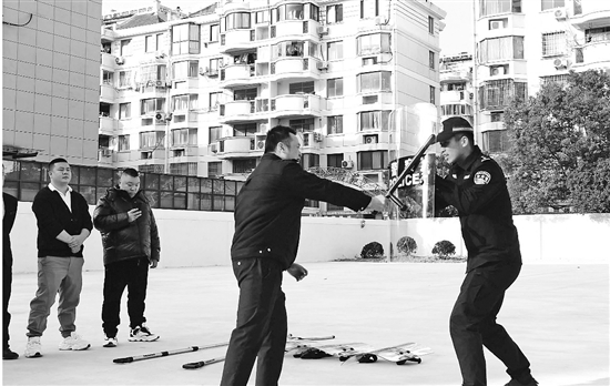 近日,台州市公安局椒江分局巡特警大队民警应邀为警保联动工作单位的负责人进行盾牌、警棍、钢叉等警用装备的使用培训,提高他们应对处置突发事件的能力和水平。