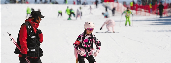 近日,小朋友在商量岗滑雪场学习滑雪。