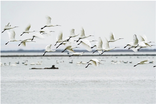 白琵鹭等候鸟在江西省南昌市新建区昌邑乡附近水域飞翔(2月18日摄)。