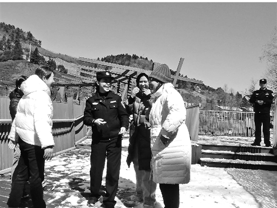 连日来,东阳市公安局虎鹿派出所扎实推进“共治共富生态警务”,境内最高峰东白山一夜雪白,让久未见雪的游客格外兴奋。图为民警与游客互动共赏雪景。
